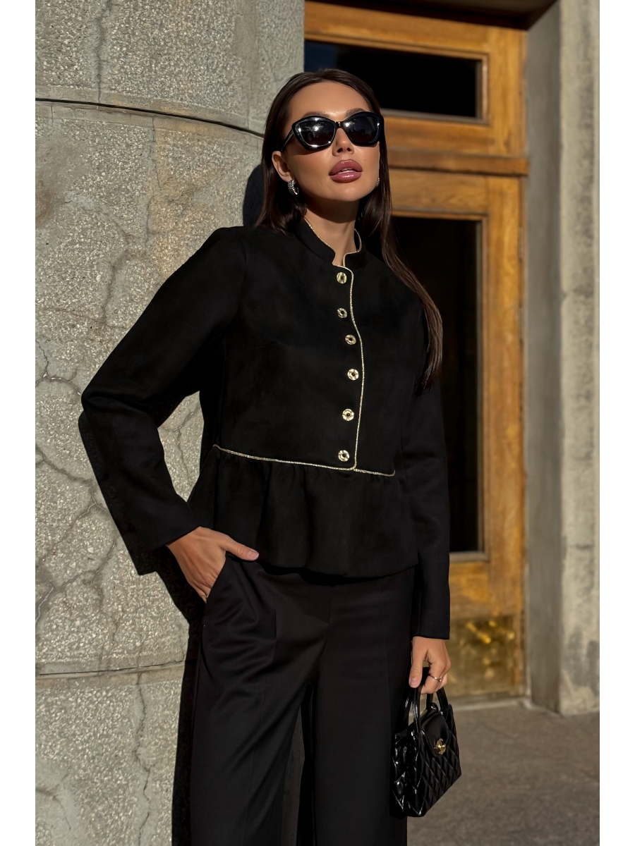 Женский чёрный замшевый жакет URS — воплощение элегантности, уверенности и изысканного вкуса. Эта модель создана для женщин, которые ценят стиль, комфорт и внимание к деталям. Жакет женский, нарядный, полуприлегающего силуэта из мягкой искусственной замши на трикотажной основе, отрезной по линии талии, с центральной бортовой застежкой от шва талии до верха на 6 петель и 6 пуговиц (размер и цвет фурнитуры может незначительно отличаться от фото). Верхняя часть переда с нагрудными вытачками от боковых швов. Верхняя часть спинки с рельефными швами, идущими от пройм вниз до шва талии. Нижняя часть переда и спинки двойная, со сгибом, со сборкой по шву талии. Верхняя часть переда и спинки, рукава на подкладке. Горловина оформлена воротником-стойкой. Рукава втачные, двухшовные, длинные. Воротник, борта, шов талии переда и спинки оформлен декоративной тесьмой. Жакет с плечевыми накладками.