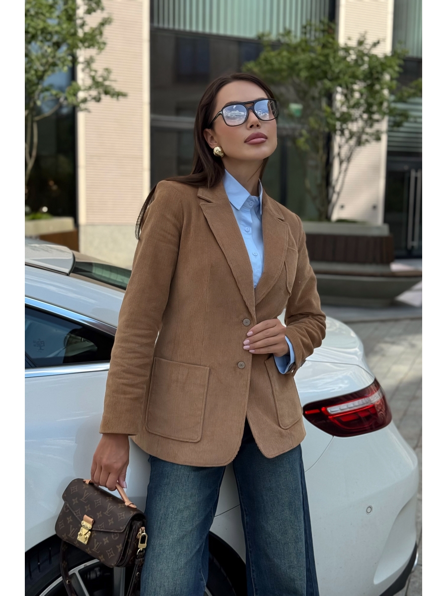 Жакет женский вельветовый коричневый URS — это сочетание элегантного стиля и практичности. Классический приталенный крой, лацканы и застёжка на пуговицы делают его универсальным вариантом для офиса, прогулок и городских встреч. Жакет женский полуприлегающего силуэта, выполнен из костюмной вельветовой ткани, на подкладке, с воротником пиджачного типа, предназначен для повседневной носки. Перед жакета с центральной бортовой застежкой на 2 петли и 2 пуговицы (фурнитура может незначительно отличаться от фото), с закругленными по низу бортами. Перед с полурельефами и с вертикальными рельефными швами. Нижние части переда и верхняя левая часть переда с накладными карманами закругленной формы. Спинка с рельефными швами, со средним швом в нижней части со шлицей. Рукава втачные двухшовные длинные, локтевые швы со шлицей, застегивающиеся на 4 петли и 4 пуговицы (фурнитура может незначительно отличаться от фото). По краю борта, лацканам, воротнику, карманам прострочена отделочная строчка шириной 0,5 см. Жакет с плечевыми накладками.
