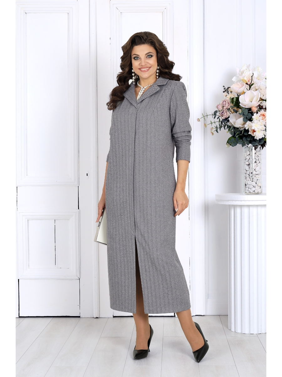 Платье женское прямого силуэта, выполнено из трикотажного полотна «елочка». Модель без подкладки, без застежки. В боковых швах платья обработаны карманы. По переду – имитация потайной бортовой застежки; от плечевых швов к центру груди направлены вытачки. Спинка со средним швом. Воротник пиджачного типа. Рукав втачной, длинный, с притачной, замкнутой манжетой по низу. Длина платья – 123 см.; длина рукава – 59 см