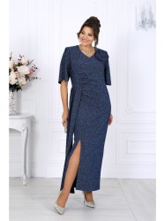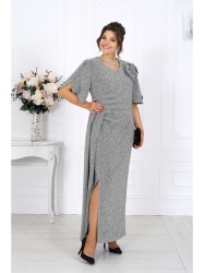 Платье женское полуприлегающего силуэта, выполнено из трикотажного полотна с фактурной лицевой стороной «люрекс». Модель на трикотажной подкладке, с плечевыми накладками. В левом боковом шве обработана застежка на потайную тесьму-«молнию» (35 см). Перед платья с горизонтальным подрезом по линии талии и отлетной деталью в шве подреза. В правой части переда обработан рельеф с разрезом в нижней части. Вдоль рельефного шва заложены односторонние складки, направленные к центру переда. Спинка с талиевыми вытачками. Горловина спинки округлая, по переду V-образная, углубленная. Рукав короткий, втачной, формы «крылышко на запах», со скругленными краями. Платье дополнено съемным «цветком» из основного полотна. Длина платья - 136 см; длина рукава - 31 см.