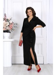 Платье женское полуприлегающего силуэта, выполнено из трикотажного полотна с фактурной лицевой стороной «люрекс». Модель на трикотажной подкладке, с плечевыми накладками и застежкой в левом боковом шве на потайную тесьму-«молнию» (35 см). Перед отрезной по линии талии. Верхняя часть переда состоит из двух деталей, скрепленных на запах; вдоль горизонтального подреза заложены односторонние складки. На нижней части переда обработан рельефный шов с двойным воланом в верхней части и разрезом по низу; от шва к центру направлены односторонние складки. На спинке обработаны талиевые вытачки. Рукав трехчетвертной. Платье дополнено съемным «цветком» из основного полотна. Длина платья – 134 см; длина рукава – 42 см.