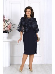 Платье женское полуприлегающего силуэта, выполнено из трикотажного полотна с фактурной лицевой стороной «люрекс». Модель на трикотажной подкладке, с плечевыми накладками и застежкой в левом боковом шве на потайную тесьму-«молнию» (35 см). Перед отрезной по линии талии. Верхняя часть переда состоит из двух деталей, скрепленных на запах; вдоль горизонтального подреза заложены односторонние складки. На нижней части переда обработан рельефный шов с двойным воланом в верхней части и разрезом по низу; от шва к центру направлены односторонние складки. На спинке обработаны талиевые вытачки. Рукав трехчетвертной. Платье дополнено съемным «цветком» из основного полотна. Длина платья – 134 см; длина рукава – 42 см.