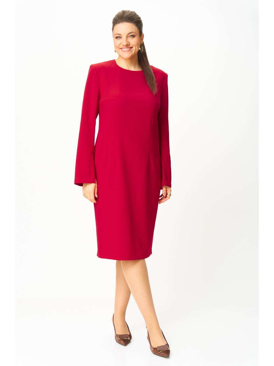 Элегантное женское платье, прилегающего силуэта: по переду и спинке вытачки по талии. Горловина круглая. Застежка на молнию в центральном шве спинки. Рукава втачные, двухшовные, расширенные к низу, в переднем шве, по низу, разрез.
