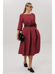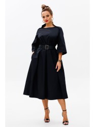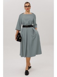 Шикарное платье с поясом ремнем. Отличный вариант универсального изделия: подойдет как для повседневного и офисного гардероба, так и для праздничного выхода. Отрезное по линии талии. По полочке объем груди создается за счет направленных складок из подреза. Объем юбки создается за счет центральной встречной и 2-х односторонних складок. По бокам в юбке-карманы. Рукав втачной, 3/4 длинны с отворотом. Вырез горловины лодочка с отложным воротником.