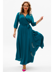 Элегантное женское платье из блузочной ткани отрезное по линии талии. Благодаря своему крою прекрасно будет смотреться на любой фигуре, скрывая недостатки. Спинка и полочка-двойные. Юбка-солнце-клеш (двойная). На лифе переда-нагрудные вытачки с проймы и по 2-е мягкие складки по талии. Спинка со средним швом и выточками. В правом боковом шве лифа - отверствие для пояса,который протягивается и завязывается по переду. Рукав втачной,одношовный, длиной 3/4. По низу рукава - мягкие складки. В качестве декора - металлизированная бахрома по горловине полочки и по краю пояса.