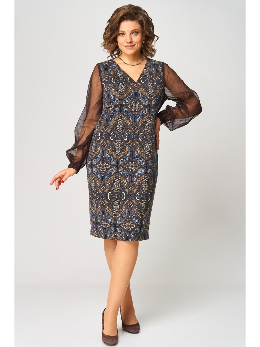 Платье полуприлегающего силуэта с горловиной V-образной формы. Перед с нагрудными вытачками. Спинка с талиевыми вытачками и разрезом в среднем шве. Рукав прозрачный из сетки, втачной прямой длинный, на резинке по низу.
