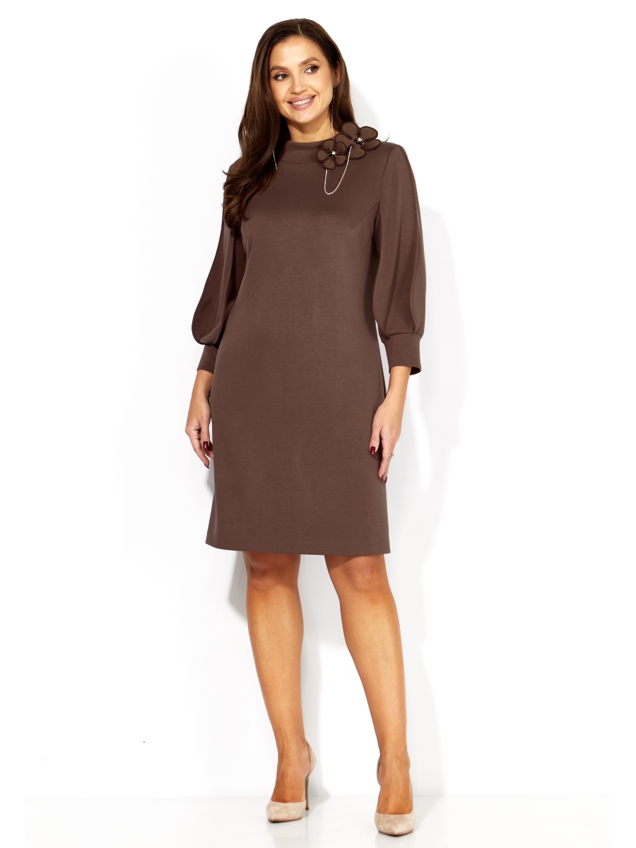 Платье женское, А-силуэта с втачным рукавом, длинной 3/4. Рукав фантазийной формы, типа "фонарик" состоящий из четырех деталей. Швы рукава отстрочены стройкой "на ребро" По переду нагрудные вытачки из пройм. Горловина оформлена расширенной, мягкой строчкой.