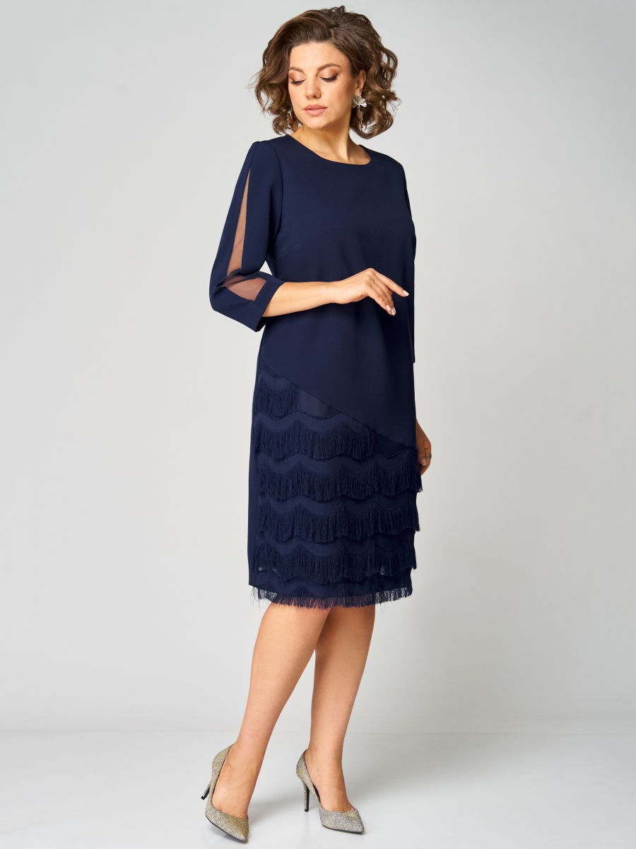Оформить заказ →Платье полуприлегающего силуэта. Округлый вырез горловины, обработан обтачкой. Перед с нагрудными вытачками и подрезом из бахромы по диагонали. Трикотажная подкладка идет от подреза только по переду. Рукав втачной, по центру рукава вставка из сетки. Спинка со средним швом и разрезом по низу, застежка на потайную тесьму-молнию.