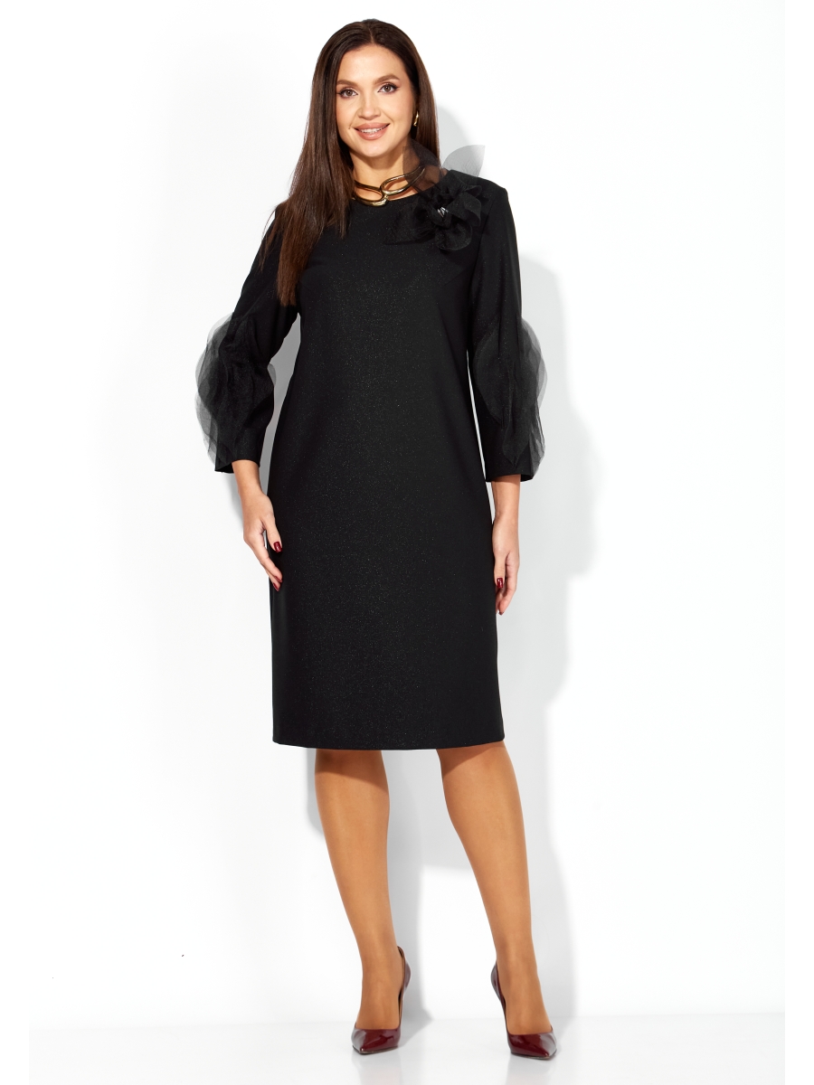 Платье женское, прямого силуэта, выполнено из ткани поливискоза "SHANE" со стрейчем. Рукав втачной, длинной 7/8. Нижняя часть рукава задекорирована фантазийными элементами из огранзы. По переду нагрудные вытачки из пройм. Вырез горловины круглой формы. По спинке средний шов и застежка на потайную тесьму "молния".