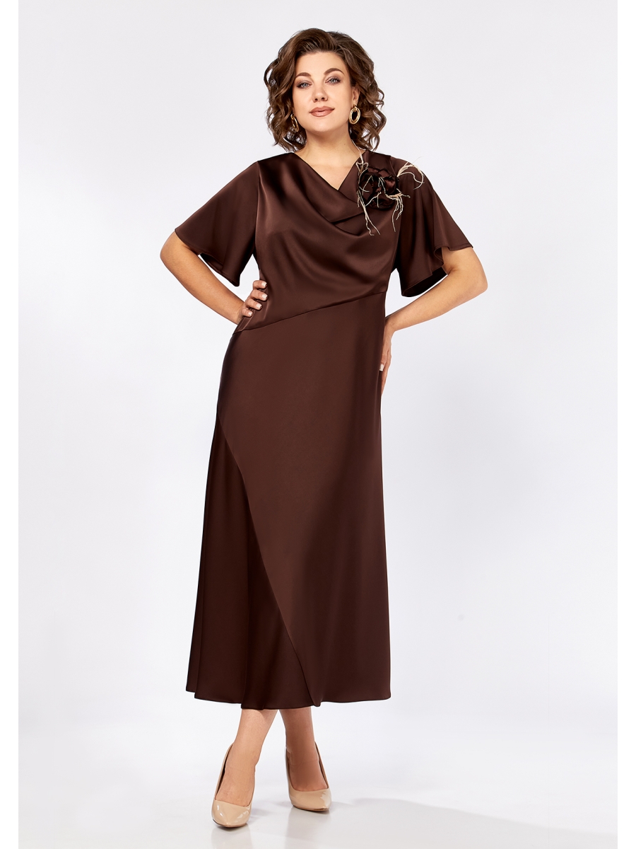 Эффектное, женское платье полу-прилегающего силуэта выполнено из атласа. На полочке выполнены ассиметричные подрезы, горловина свободного покроя-«качели», декорирована съемным цветком. Спинка также с ассиметричными подрезами, рукав втачной, укороченный.