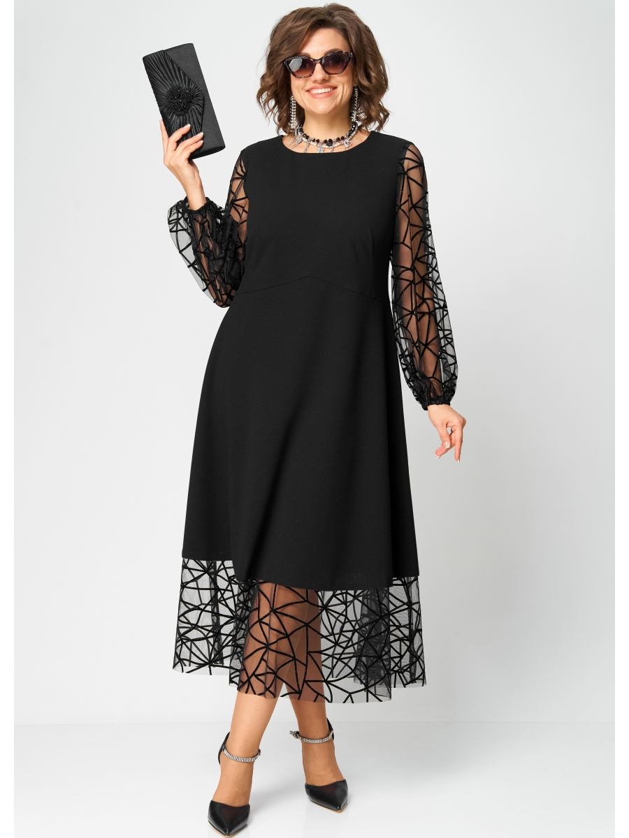 Платье шикарное женское нарядное вечернее полуприлегающего силуэта расширенное к низу, выполнено из плательного крепа в сочетании с сеткой с принтом в виде паутинки. Вырез горловины круглый на обтачке, по спинке застежка на навесную петлю и пуговицу. Рукав втачной из сетки по низ собран на резинку. Платье с фигурным подрезом по полочке, по низу притачной волан из сетки.