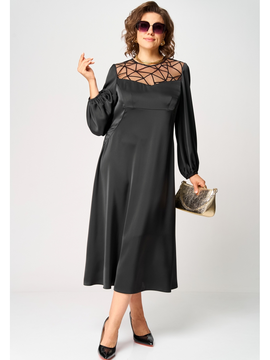 Платье женское нарядное полуприлегающего силуэта расширенное к низу. Выполнено из плательной ткани в сочетании с отделкой. Вырез горловины круглый обработан косой бейкой, рукав втачной по низу собран на притачной резинке. По переду платье отрезное по линии груди, верх отрезная фигурная кокетка из отделочной ткани, по спинке потайная тесьма молния.