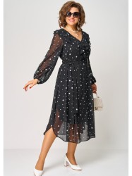 Платье женское нарядно-повседневное полуприлегающего силэта до талии расширенное к низу. Платье отрезное по талии на трикотажной подкладке, выполнено из креп-шифона. Вырез горловины V-образный обработан обтачкой, по горловине полочки и спинки двойные воланы. Рукав втачной по низу на резинке. По юбке небольшие складки. В боковых швах обработаны разрезы, низ фигурный.
