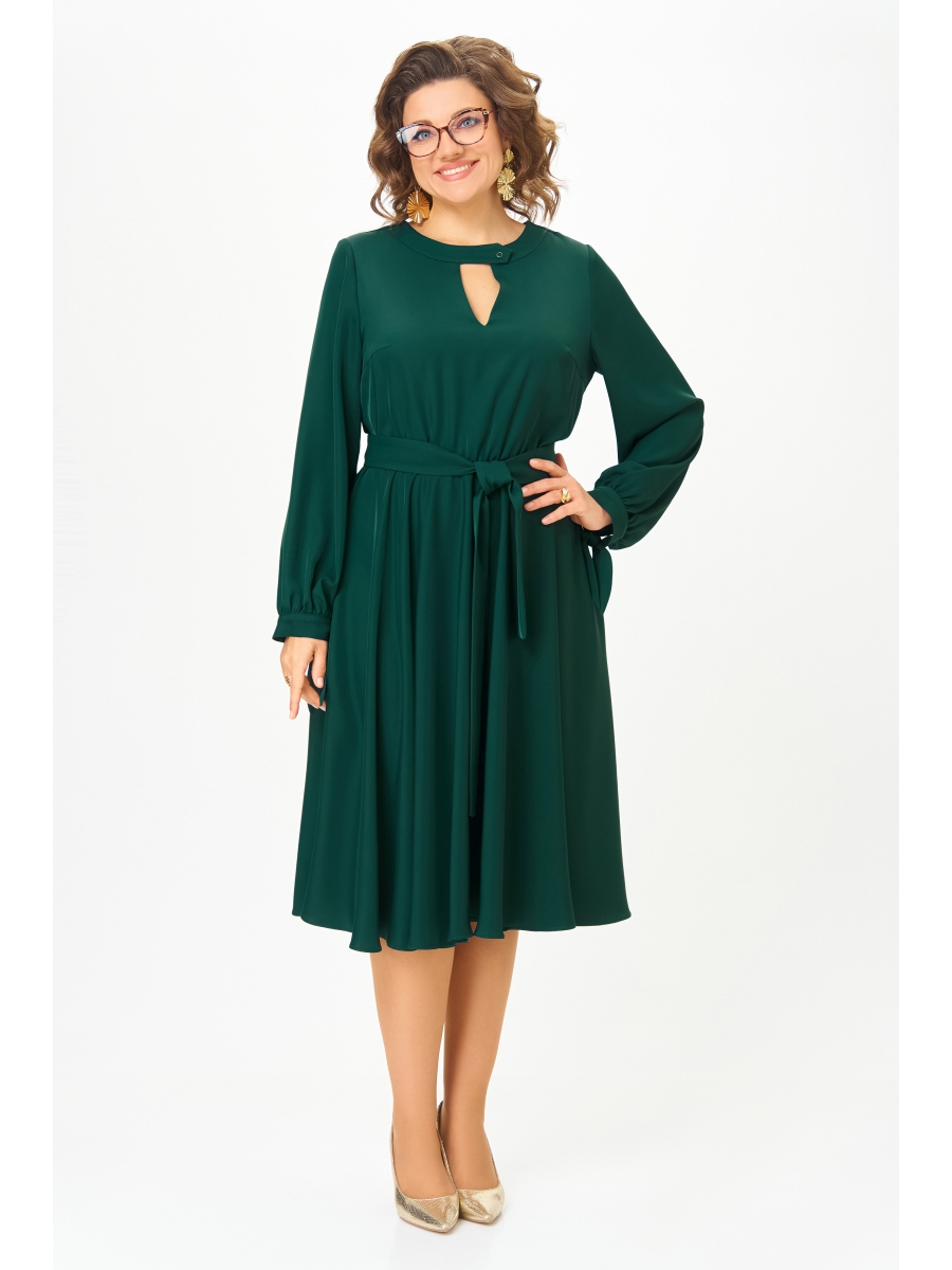 Платье из поливискозного полотна Х-образного силуэта, отрезное по линии талии. По переду лифа обработаны нагрудные вытачки, удлинённый V-образный вырез и отрезанная декоративная кокетка с застёжкой на кнопку. Спинка лифа цельная. Юбка расклешённая с карманами в боковых швах. Рукав втачной, одношовный со сборкой по шву притачивания манжеты. По низу рукава обработана манжета с завязками. По талии платье собрано на эластичную тесьму-резинку.