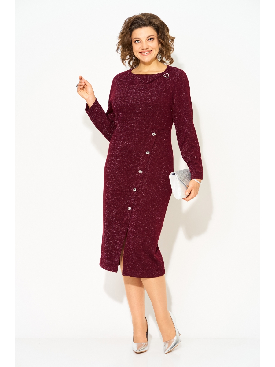 Элегантное платье в винном оттенке, выполнено из качественной плотной трикотажной ткани, которая отлично тянется и принимает все изгибы вашего тела, искусно маскируя недостатки. Платье отрезное чуть выше талии, с эффектным ассиметричным подрезом с застежкой на декоративные пуговицы. Длинный рукав, покроя реглан, заужен к низу. Лиф украшает небольшая сборка с декоративной брошью. Спинка прилегающая.