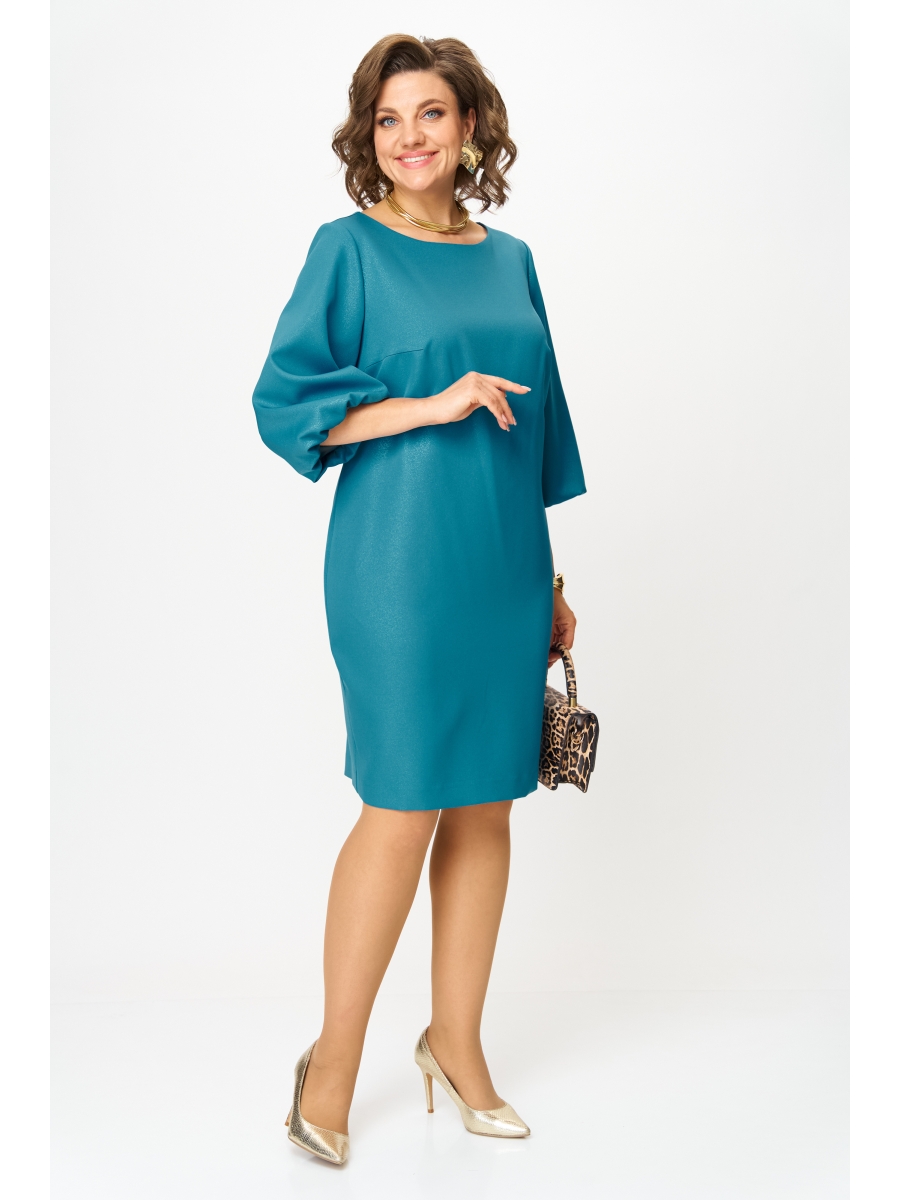 Нарядное платье выполнено из вискозной ткани с легким блеском. Платье имеет вырез лодочкой, который элегантно подчеркивает линию шеи. Объемные рукава добавляют романтичности и воздушности, создавая эффект легкой драпировки.