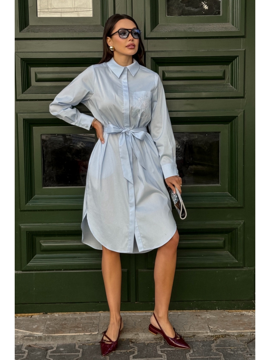 Элегантное голубое платье-рубашка с поясом и вышивкой на нагрудном кармане — идеальный выбор для повседневного и офисного образа. Модель выполнена из качественной костюмной ткани, приятной к телу, сдержанно сияющей на солнце. Благодаря прямому силуэту и акценту на талии за счёт пояса, платье выгодно подчеркивает фигуру и подходит для любого типа телосложения.