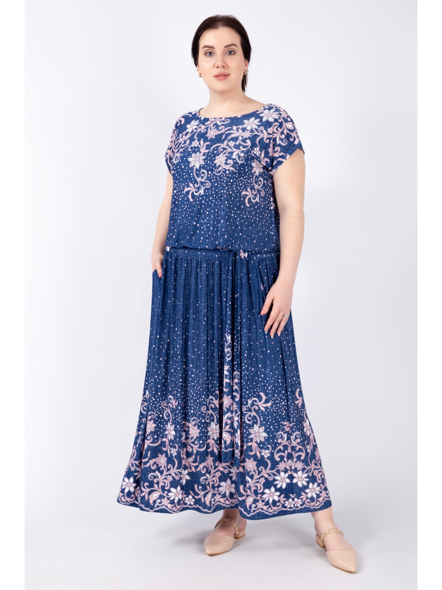 Восхитительное женское платье, выполнено из лёгкого, струящегося трикотажного полотна с оригинальным принтом. Длинное в пол, вырез горловины округлый, плечо приспущено. Чуть-чуть занижена линия талии на резинке, что позволяет регулировать длину юбки. Кокетка на бёдрах с поясом продетым через шлёвки. Имеются боковые карманы.