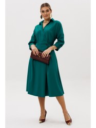 Элегантное женское платье из костюмной ткани необычного кроя станет изюминкой вашего гардероба. Платье полуприлегающего силуэта, отрезное по линии талии со спущенным плечом. Рукав 3/4 длинный на отрезной манжете. По полочке идут защипы-складки в верхней и нижней частях, запах - на петли и пуговицы по подрезу. По нижней части платья запах идет в виде складки. По спинке кокетка со складкой, по подрезу вставлена резинка. Юбка-полусолнце с односторонними складками по полочке, по бокам карманы. По горловине воротник на отрезной стойке. Платье будет идеально смотреться с туфлями, ботинками и сапогами.