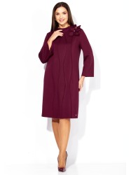 Платье женское, чуть А-силуэта, с втачным рукавом, длинной 7/8. По центу переда объемные, фигурные рельефы. Горловина оформлена небольшой мягкой стойкой. Декором служат съемные цветки-броши. По низу платья отделочная нашивка. Спинка со средним швом.