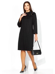 Платье женское, чуть А-силуэта, с втачным рукавом, длинной 7/8. По центу переда объемные, фигурные рельефы. Горловина оформлена небольшой мягкой стойкой. Декором служат съемные цветки-броши. По низу платья отделочная нашивка. Спинка со средним швом.