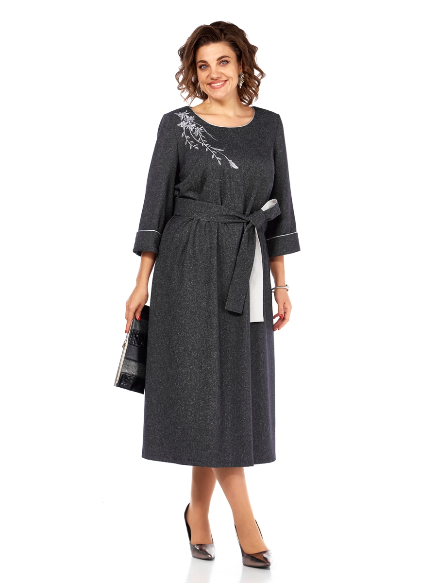Платье женское, свободного кроя, изготовлено из костюмно-плательной ткани. Горловина круглой формы с кантом. По переду нагрудные вытачки. Перед и спинка отрезные, по линии талии со сборкой по юбке. В боковых швах обработаны карманы. Рукава втачные с отложными манжетами и с кантом. Пояс съемный, выполнен из основной и отделочной ткани. В качестве декора дизайнерская вышивка.