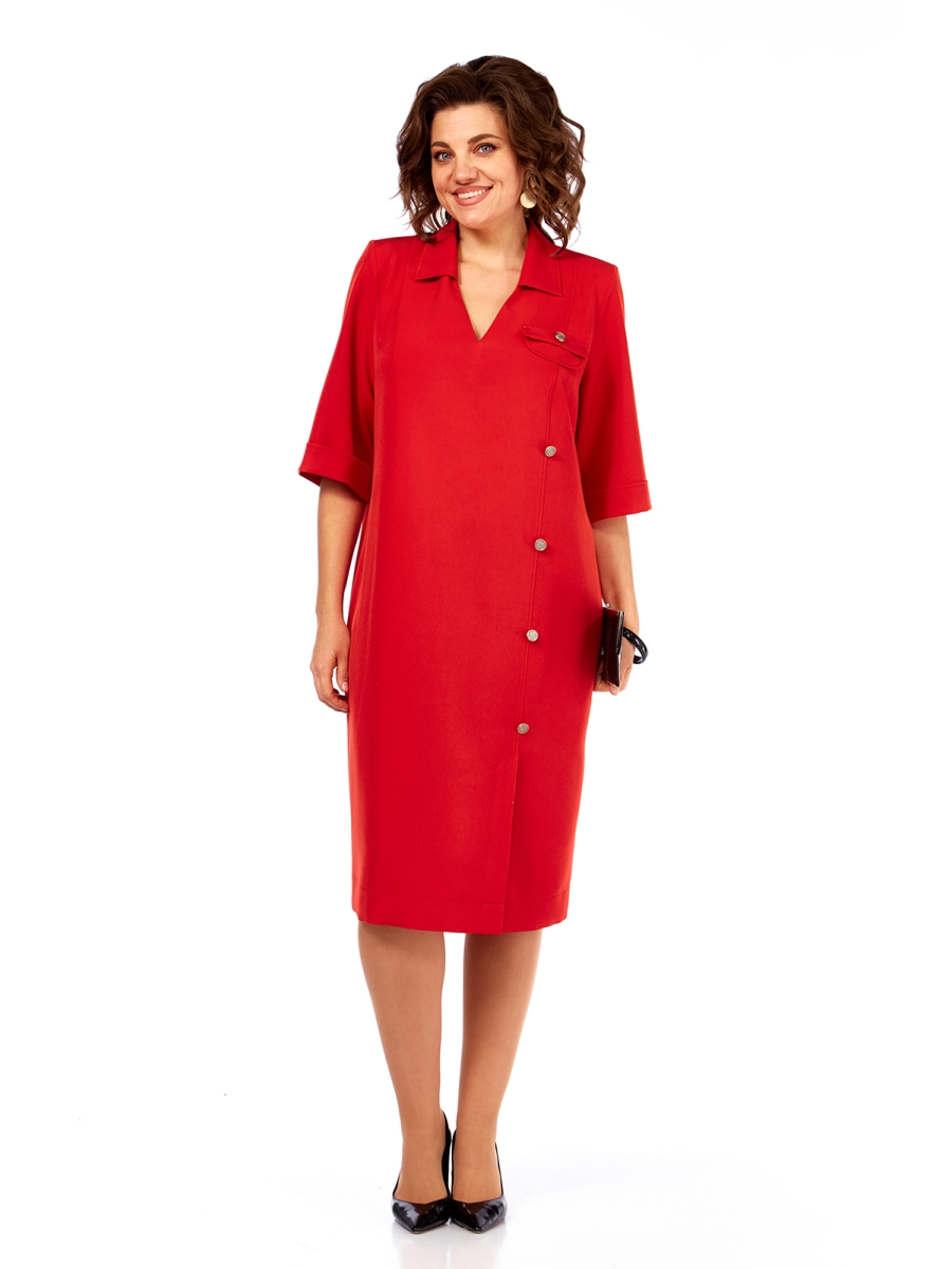 Платье женское прямого силуэта, выполнено из костюмно-плательной ткани. Вырез V-образной формы с отложным воротником. По переду обработан ассиметричный рельеф со шлицей по низу и декоративный клапан на груди. Спинка с кокеткой и средним швом. Рукава втачные, по низу отложные манжеты. Платье дополнено съемным поясом из основной ткани с полукольцами и декоративными пуговицами.