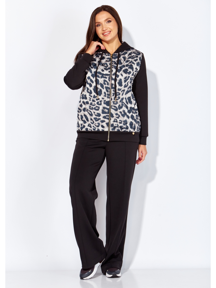 Брюки широкие, прямые. По боку подрезной лампас с отделочной строчкой и карманы. По центру переда прострочены защипы ("стрелка"). Капюшон, рукава, манжет низа куртки и брюки из трикотажного полотна.