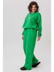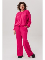 Верхняя часть костюма, выполненная в виде объемного свитшота, представляет собой мастерское сочетание расслабленных линий и продуманных деталей. Удлиненная линия плеча и длинные рукава струятся мягкими складками, завершаясь аккуратной манжетой. Фронтальная часть оформлена изящной отрезной кокеткой, а накладные карманы с клапанами, добавляюют образу тактильной выразительности. Низ свитшота, оформленный на кулиске, позволяет вам самостоятельно регулировать степень свободы и объем, делая силуэт именно таким, как вам хочется сегодня.