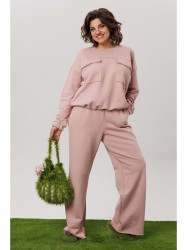 Верхняя часть костюма, выполненная в виде объемного свитшота, представляет собой мастерское сочетание расслабленных линий и продуманных деталей. Удлиненная линия плеча и длинные рукава струятся мягкими складками, завершаясь аккуратной манжетой. Фронтальная часть оформлена изящной отрезной кокеткой, а накладные карманы с клапанами, добавляют образу тактильной выразительности. Низ свитшота, оформленный на кулиске, позволяет вам самостоятельно регулировать степень свободы и объем, делая силуэт именно таким, как вам хочется сегодня.