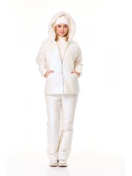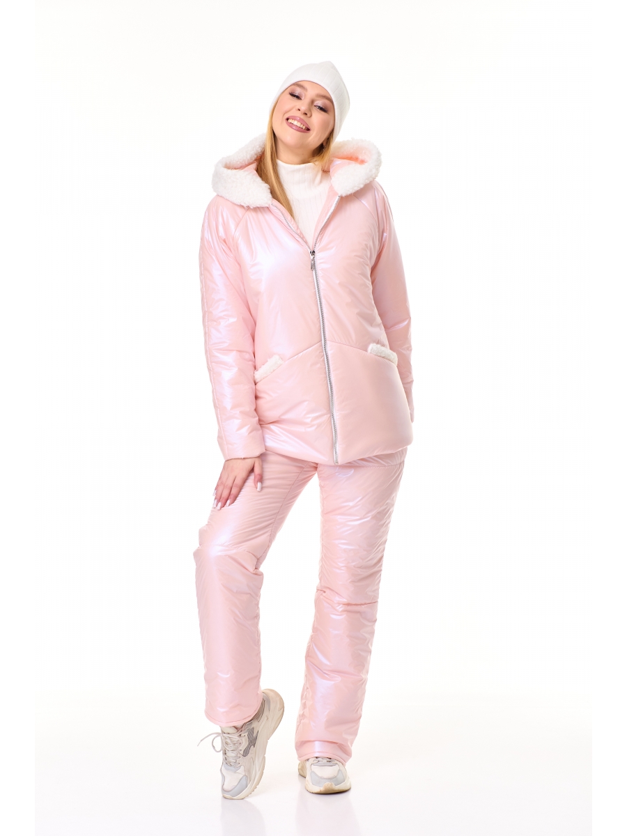 Зимний воздушный комплект в нежном перламутровом цвете с меховой отделкой состоит из куртки и утепленных брюк.