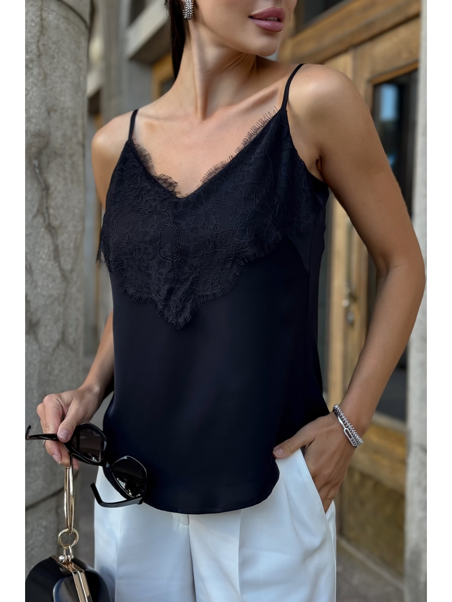 Блузка женская ЮРС, на бретелях, полуприлегающего силуэта, выполнена из блузочной ткани на подкладке, может быть как нарядная, так и повседневная. Перед с нагрудными вытачками, выходящими из боковых швов. Верхняя часть переда декорирована кружевом. Низ переда и спинки фигурной формы: короче у боковых швов, длиннее к центрам.