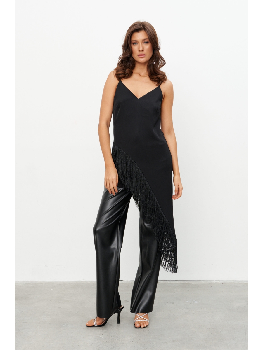 Оформить заказ →Топ на бретелях с асимметричным низом, обрамлённым бахромой, выполнен из струящейся ткани. Длина бретелей регулируется.