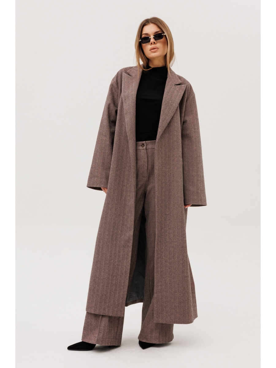 Кардиган женский, выполнен из теплой ткани, свободного силуэта со спущенным плечом, в боковых швах разрезы. Рукав длинный. По переду накладные карманы. Кардиган на подкладке.